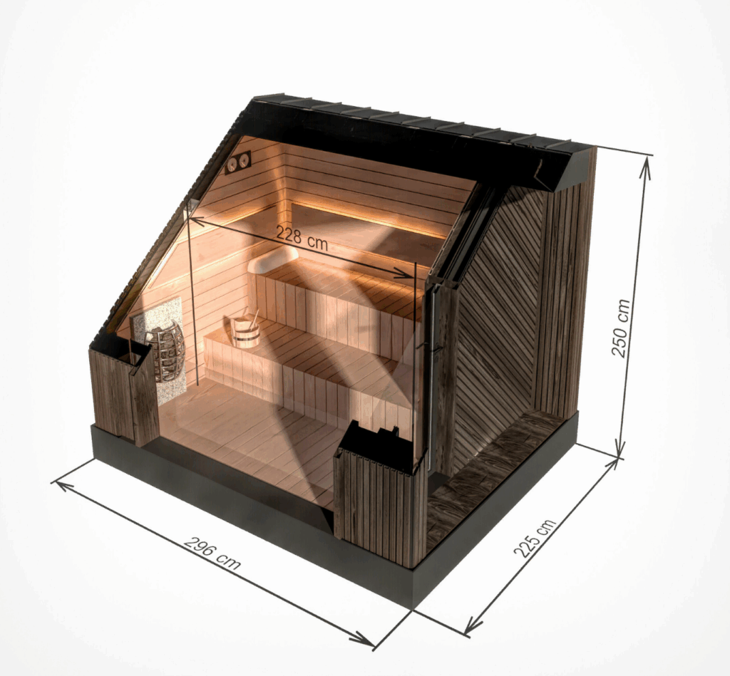 Wnętrze wykonane z naturalnego, jasnego świerku zostało zabezpieczone woskiem, co pozwala zachować świeży, estetyczny wygląd drewna przez lata. Sauna mieści do 6 osób, oferując wygodną przestrzeń do relaksu. Oświetlenie LED dostępne w różnych wariantach pozwala stworzyć indywidualną atmosferę. Panoramiczna szyba z hartowanego szkła może zostać wykonana w wersji przyciemnionej — estetyczny detal, który podkreśla minimalistyczny charakter.